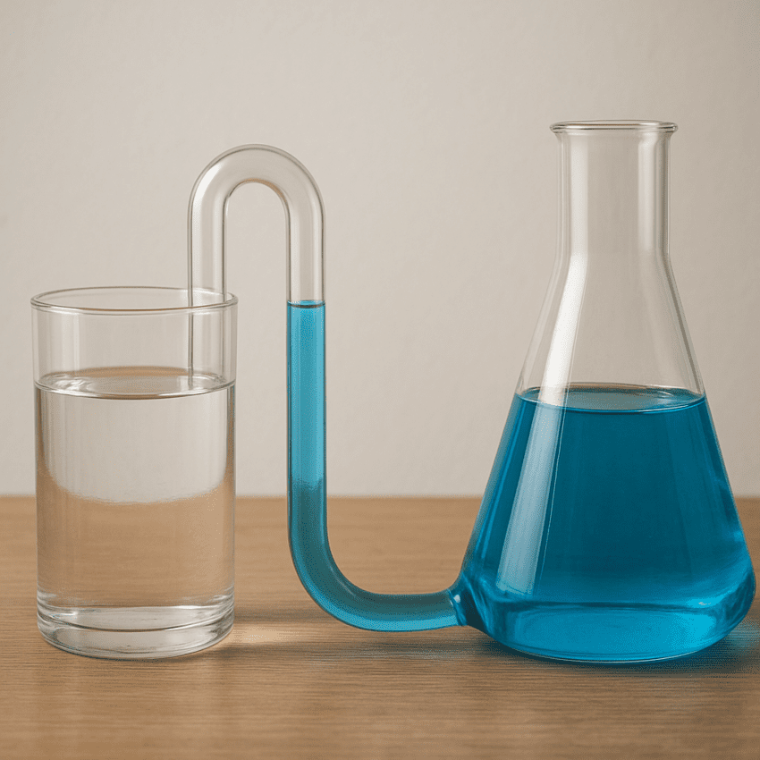 Naczynia połączone to układ co najmniej dwóch naczyń, które łączy wspólna przestrzeń u podstawy, umożliwiając swobodny przepływ cieczy między nimi. Kiedy napełnimy je cieczą, zjawisko równowagi powoduje, że poziom cieczy wyrównuje się w obu naczyniach.