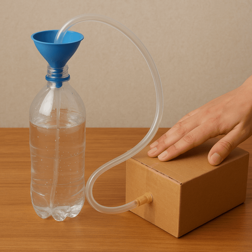 Przygotowanie polega na napełnieniu butelki wodą do pewnego poziomu tak, aby rurka silikonowa zanurzała się w cieczy. Strzykawkę podłączamy do drugiego końca rurki, tworząc szczelny układ. Następnie za pomocą strzykawki możemy wprowadzać dodatkowe ciśnienie lub je zmniejszać, obserwując jednocześnie zachowanie cieczy w butelce i rurce. Barwnik spożywczy ułatwia wizualizację ruchów cieczy i zmian poziomu, co daje lepszy ogląd na zjawisko rozchodzenia ciśnienia.
